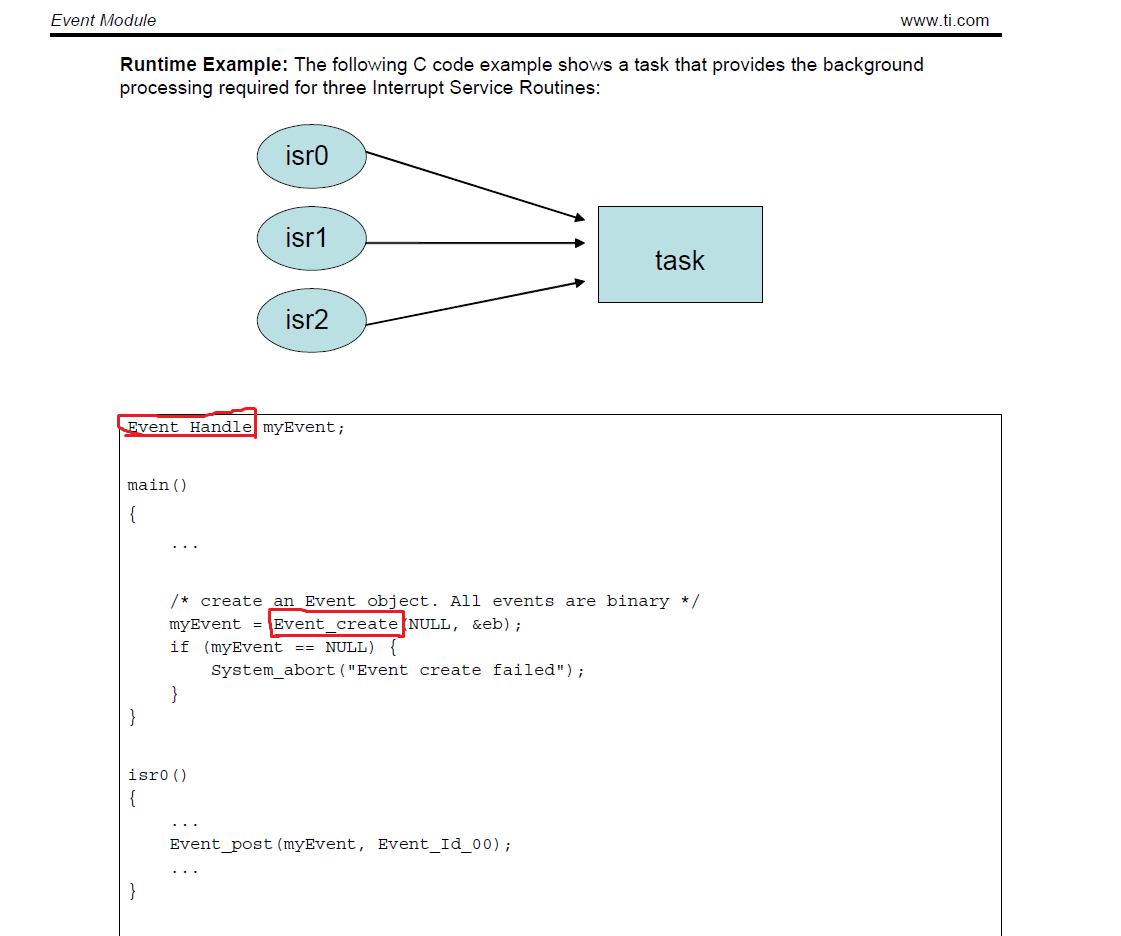 CC3200要开多任务,无奈手上的关于多任务的demo不多,就去看它的技术文档SYS/BIOS (TI-RTOS Kernel) v6.45 User's Guide,里面也提到了线程同步的东西,我就想用它的Event Module,等某个事件响应后再来启动某个任务,我按它给的代码复制了一段,然后发现根本不能用,比如它声明了一个Event_Handle myEvent;实际上在CCS中这样声明后根本就不识别Event_Handle 这个类型,而必须声明成Event_Object,而它提到的Event_create函数我在Event.c中也没有找到,真是好难啊。还有其他地方也感觉跟那些sdk中demo的代码风格很不一样(比如任务的创建等),看着很迷惑,我想说这技术文档到底靠谱么?为什么就不能给些关于这些的demo呢(目前只见到过一个跟多线程相关的freertos_demo),还是我没有发现它们?
