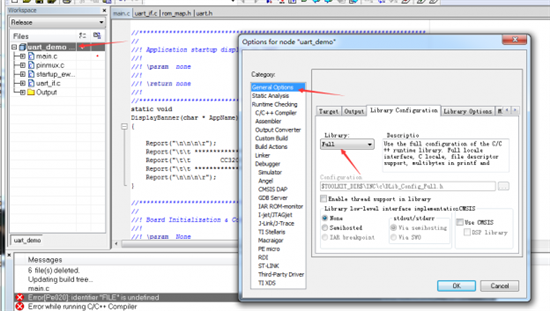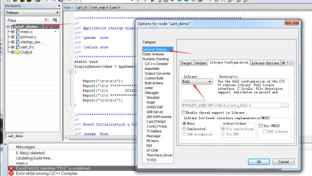这是IAR工程设置问题,FILE未定义啥的~,右键workspace的工程名uart_demo….选中Option,在GeneralOptions中选择Library Configuration