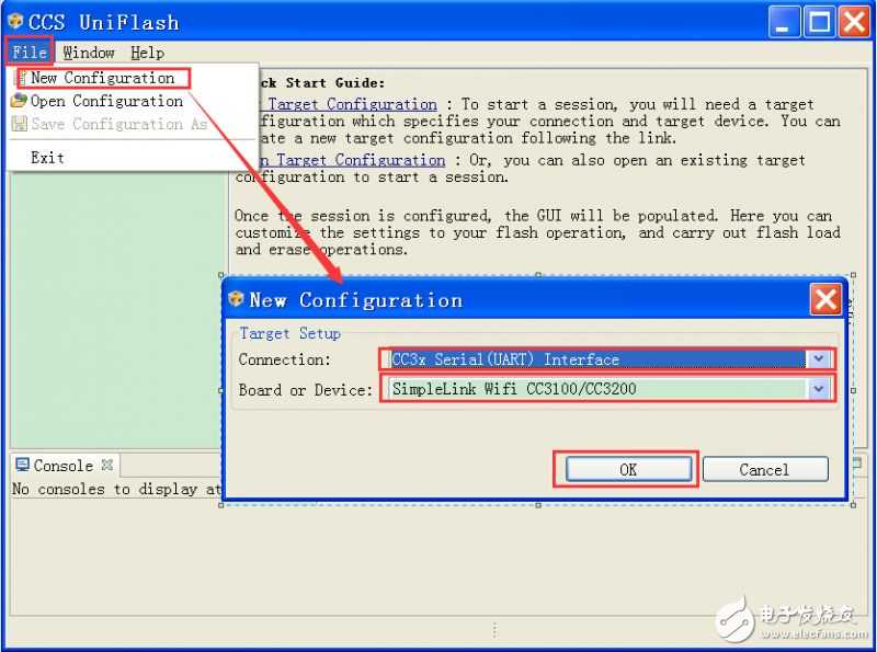 点击CCS UniFlash的“File->New Configuration”菜单,并连接CC3200开发板,如下图16所示。