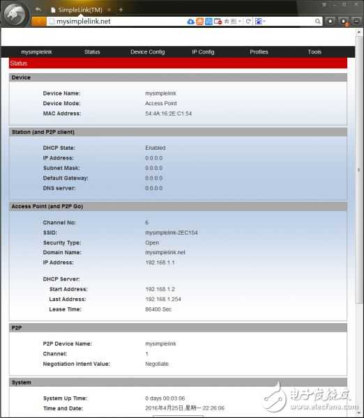 电脑完成接入后,打开浏览器并输入http://MySimpleLink.net,此时显示CC3200SDK中的out_of_box示例内容,可以查看CC3200开发板的基本状态等,如下图21所示。