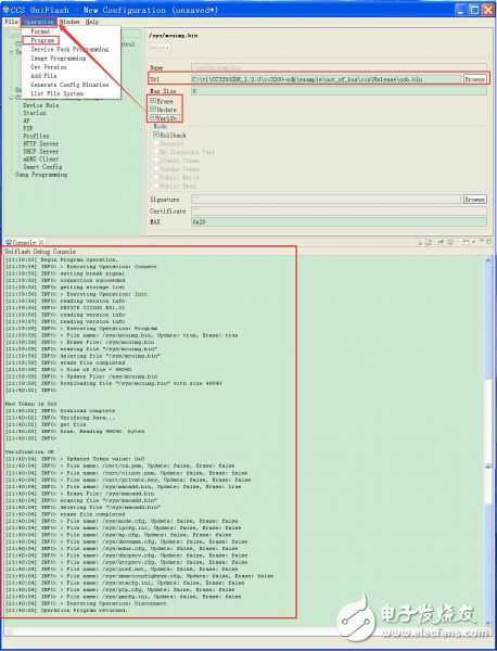 在UniFlash程序的左侧窗口中选中“System Files”项,右侧窗口中的“Url”通过“Browse”选择CC3200SDK中的“out_of_box”示例中的“oob.bin”文件。勾选“Erase”、“Update”、“Verify”三项,然后点击菜单栏上面的“Operation->Program”,开始烧录oob.bin文件。如下图19所示。