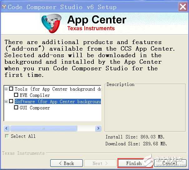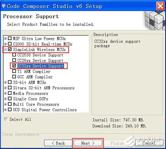 如下图4所示,此处必须勾选“CC32xx Device Support”,其它选项如果手里没有相应的开发版就别选了,注意需要下载250MB和750MB的磁盘空间,还是比较大的。