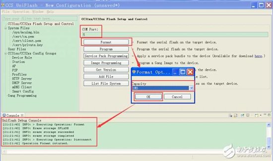 确保左侧窗口中选中的是“CC31xx/CC32xx Flash Setup and Control”,在“COM Port”中填写CC3200开发板的串口号,点击“Format”按钮,在“Capacity”中选择“1MB”并点击“OK”。稍后,在下侧的“Console”窗口中显示擦除成功并Format操作返回表示成功Format。如下图17所示。