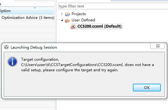 在 目标配置时,导入目标配置文件cc3200.ccxml,复制文件,一复制过来文件上就有一个红叉,也不能调试
