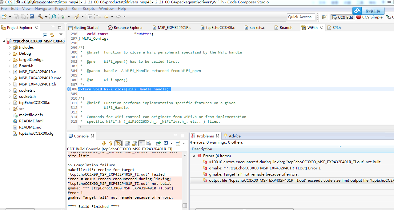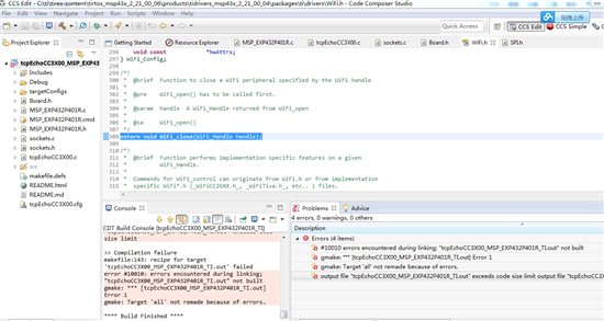 1.最近在尝试MSP432+CC3100,安装了CCS,里面有TCPEcho的历程,想试试到底是怎么工作的,但下载之后编译不过,不知道是什么原因,如下图,