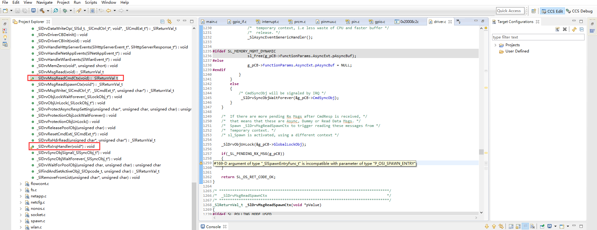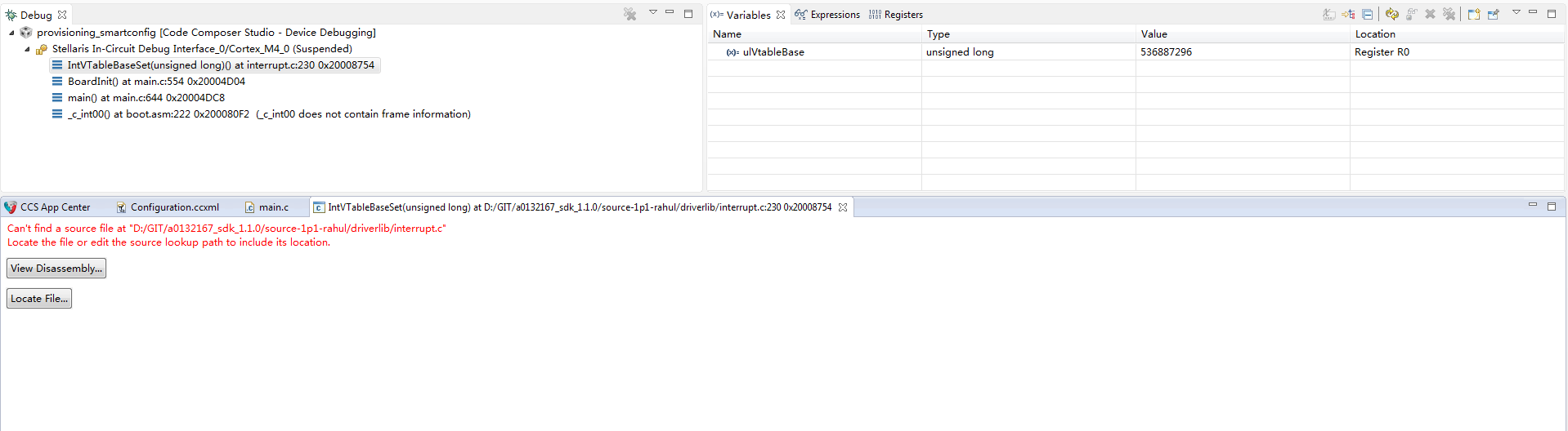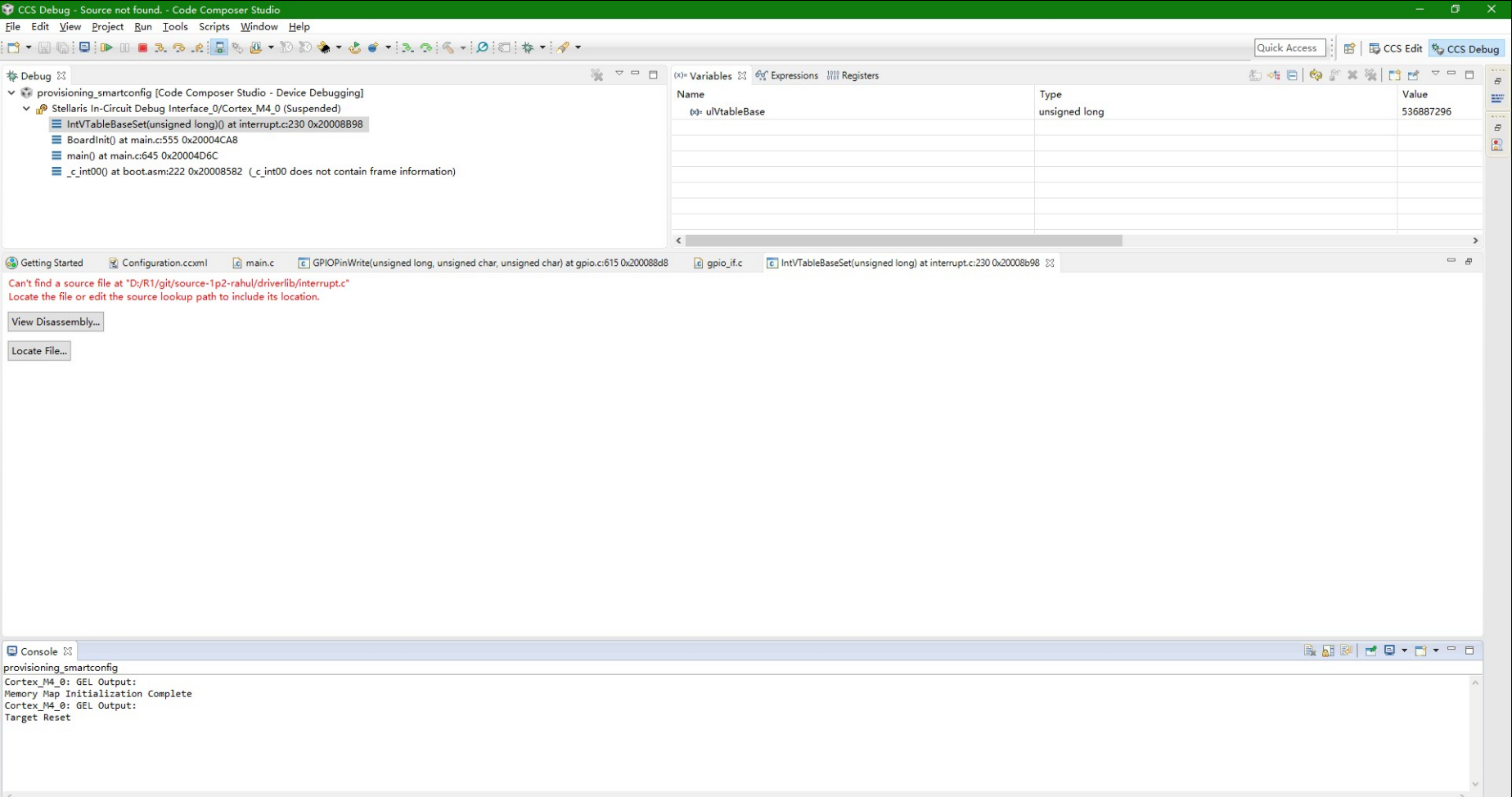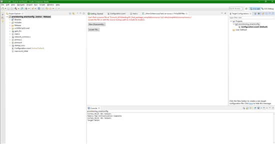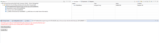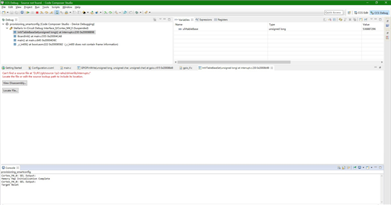 5、 连接ccs进行debug调试,我是选择单步执行,共遇到三个error,遇到后程序就停止执行。