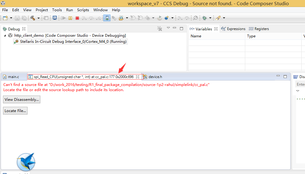 下面是提示报的错误:Can't find a source file at "D:/work_2016/testing/R1_final_package_compilation/source-1p2-rahul/simplelink/cc_pal.c"