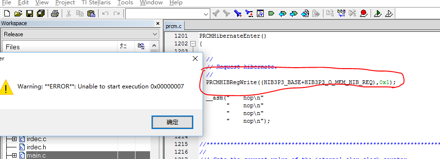 请教一下TI的工程师。 在调试 Hib demo时, 调试到MAP_PRCMHibernateEnter 函数时, 弹出了一个错误。 不明白是什么原因?