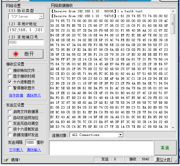 为什么我只发送了2个字符数组 第二个显示的内容比第一个多的多 而且总的接受量是5840 很大
