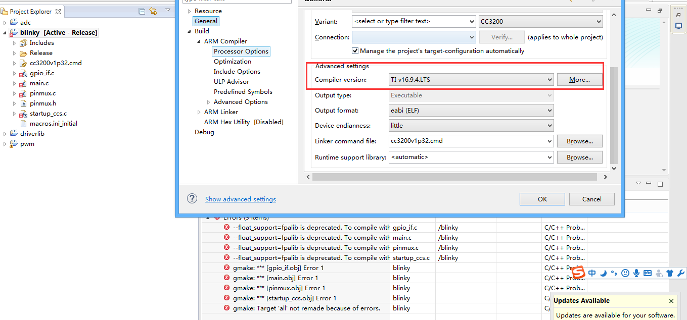 This project was created using a version of compiler that is not currently installed - 5.2.6 [ARM]. See 'Help > Install New Software' and select 'Code Generation Tools Updates' to check if this compiler is available through a CCS update. Visit <a href="liveaction:OpenAppCenter">CCS App Center</a> to get the latest compiler support. Or <a href="software-dl.ti.com/.../a> and install the compiler, then register it with CCS through 'Preferences > CCS > Build > Compilers'. blinky properties Problems