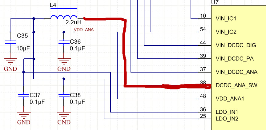 这是电路原理图,L4右端接CC3220芯片的38脚的波形出现了问题,与开发板不一样,其中CC3220的38管脚定义是Analog DC-DC switching node