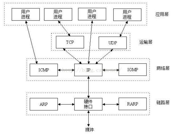 到这里就对socket在网络中的效用有了一个大体的了解,刚刚学习到这里的时候我就郁闷,这个socket在这个网络中的那一层?如何实现的呢?由于本人对网络也只是有一些基础的了解,到这里就只能求助度娘了,通过搜索发现了下面的两种图(这两种图是盗用其他博友的,还请见谅),