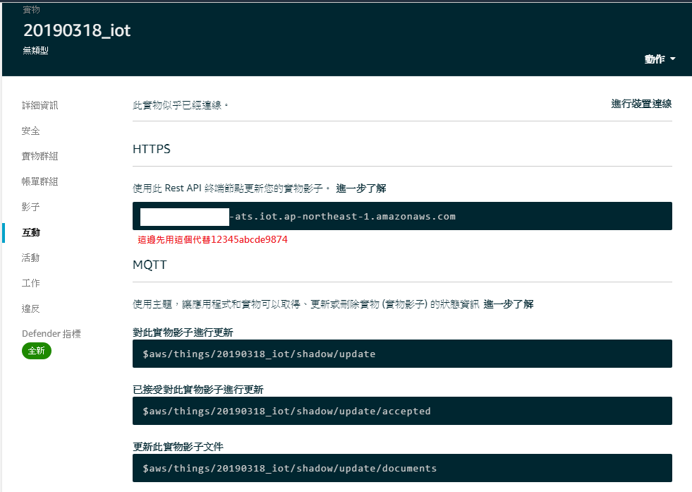 , Cert.pem 與 key.pem 係AWS-IOT-CORE 創建完"實物"後產生(非使用Play ground裡的 pem)。這3組碼我貼到certs.h裡,確定沒有TAB產生之空白。