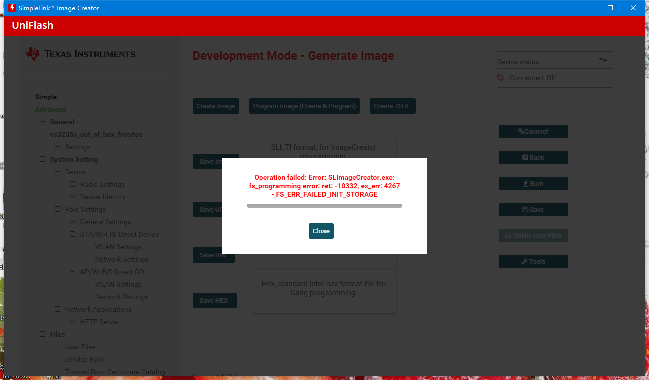 在使用Uniflash烧写bin文件到CC3235MODS中去时,UNiflash是可以connect板子的。但是下载程序时,下不进去,出现了Operation failed: Error: SLImageCreator.exe: fs_programming error: ret: -10332, ex_err: 4267 - FS_ERR_FAILED_INIT_STORAGE,请问这个问题怎么解决呢