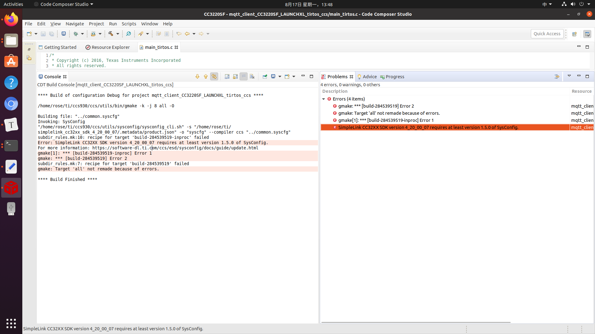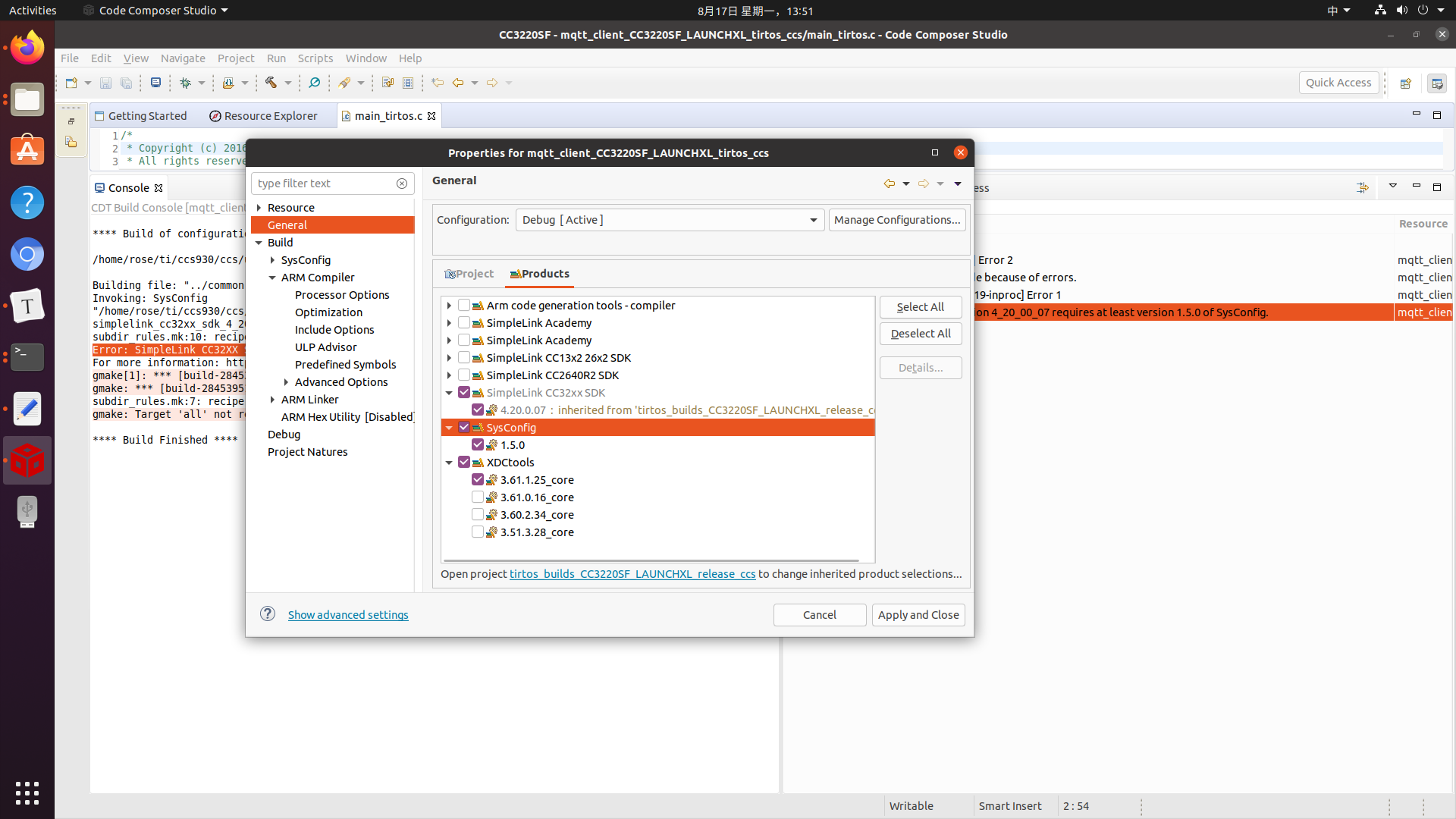 下载好CC32XX最新的SDK 4_20_00_07后,我成功导入了工程/home/rose/ti/simplelink_cc32xx_sdk_4_20_00_07/examples/rtos/CC3220SF_LAUNCHXL/demos/mqtt_client 编译的时候出现如下错误,Error: SimpleLink CC32XX SDK version 4_20_00_07 requires at least version 1.5.0 of SysConfig.
