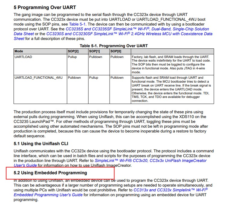 1、如何在不使用LAUNCHPAD开发板的情况下,使用别的UART串口下载程序,即图1描述的下载方式,Using Embedded Programming下载。下边的那个:CC313x and CC323x Simplelink™ Wi-Fi® Embedded Programming User's Guide手册连接失效,无法获取相关操作步骤。请提供一下相关手册及工具。