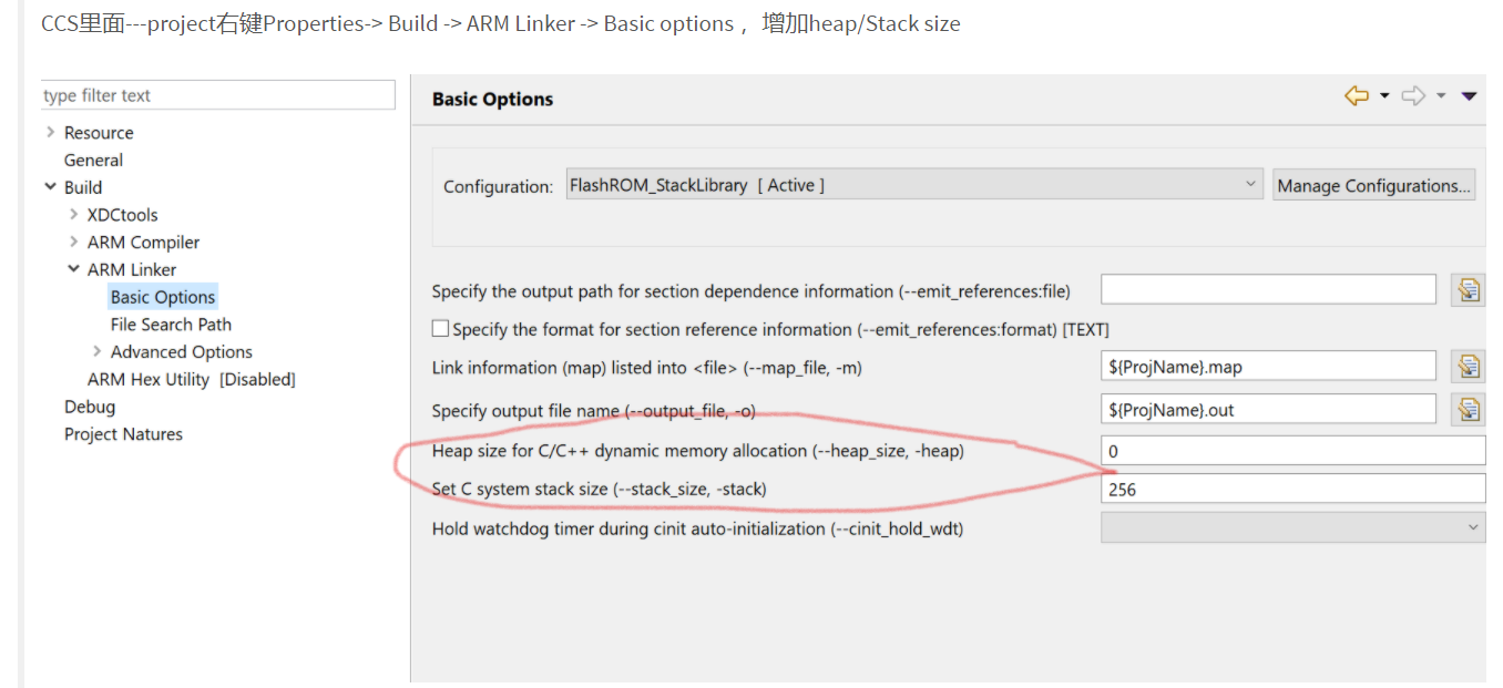 所以出错原因是栈空间不足,然后网上解决方法是:图片一 ,但我的CCS在安装GCC后,properties界面变成了以下界面,图片二 ,那怎么更改栈的大小呢?