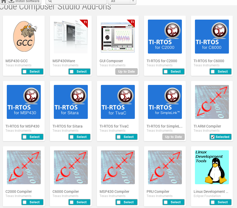 我安装了CCS6.0.1.00040_linux.tar.gz到ubuntu12.04,安装完后已经更新了,准备安装cc3200 add-ons时,发现app center里面压根就没有这个cc3200,重新启动了也没有用. 请问是什么原因? 谢谢. 附件是所有的add-ons. 另外,我已经在CCS安装时选择了simplink wireless MCUS下的ti arm compiler, 当我再安装add-ons中的ti arm compiler时,会报错.