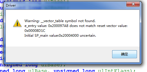 Sat Mar 21, 2015 11:33:52: Warning: __vector_table symbol not found. e_entry value: 0x200097A8 does not match reset vector value: 0x00008D1C Initial SP_main value:0x20004000 uncertain.