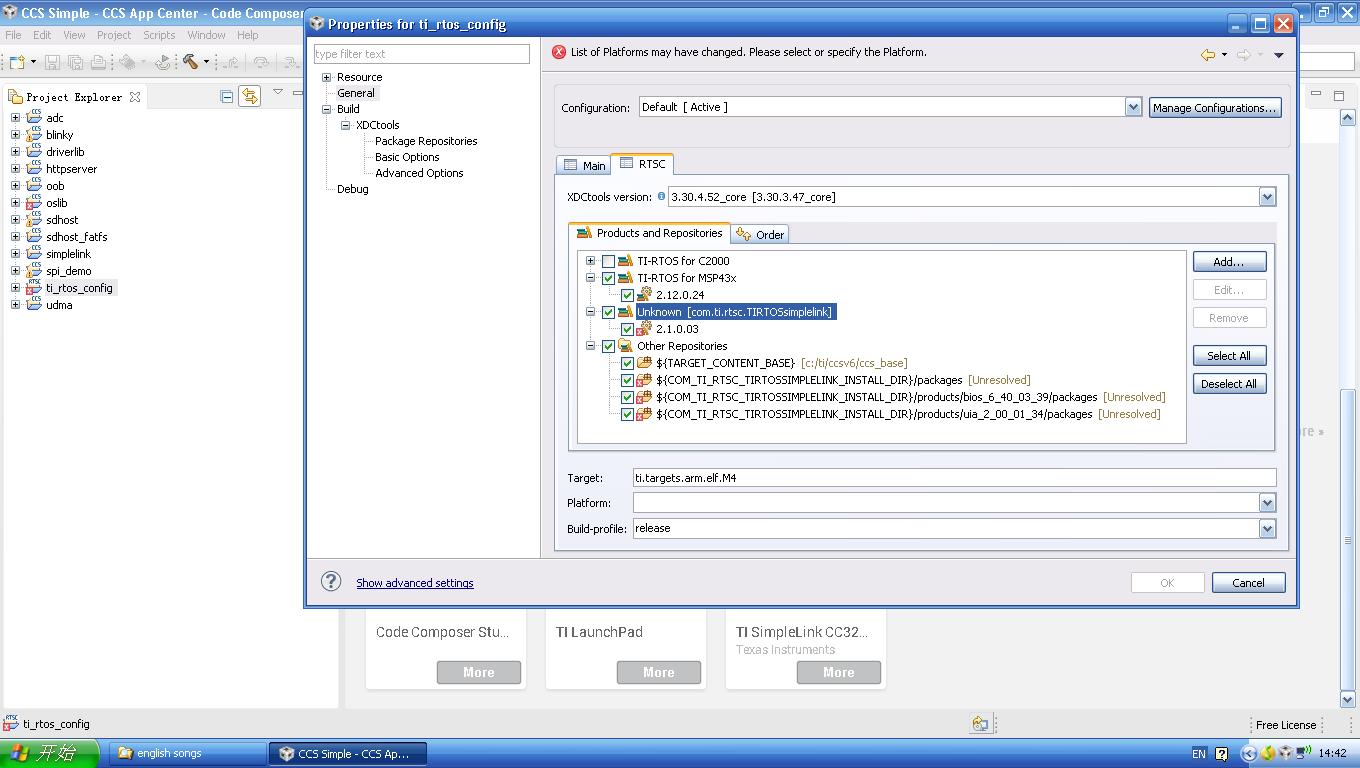Windowsxp系统,先后安装了CCS6.0.1.00040_win32、CC3200SDK-1.0.0-windows-installer.exe、CC31xx_CC32xx_ServicePack-1.0.0.1.2-windows-installer.exe、tirtos_msp43x_setupwin32_2_12_00_24.exe,然后运行CCS并加载工程ti_rtos_config,调出properties of ti_rtos_config对话框,在RTSC栏目中发现一堆错误,其中com.ti.rtsc.TIRTOSsimplelink需要如何安装,为什么CCS APP Center中没有相应的安装项?