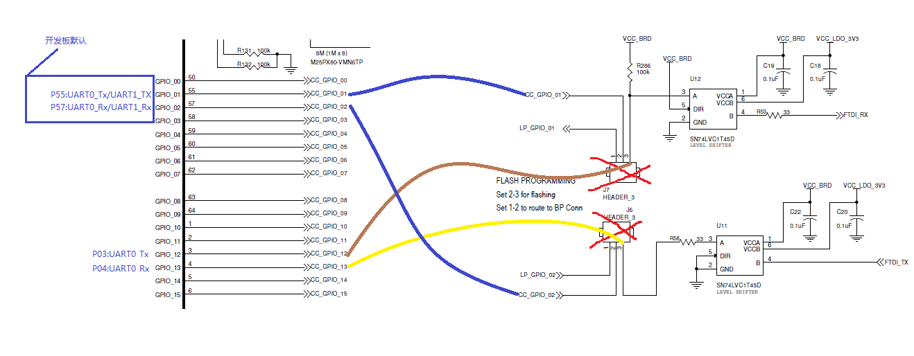 1.默认的P55、P57与FT2232D的串口相连接,下载到外部flash的代码是通过串口传送的吗,那默认是用的UART0还是UART1呢