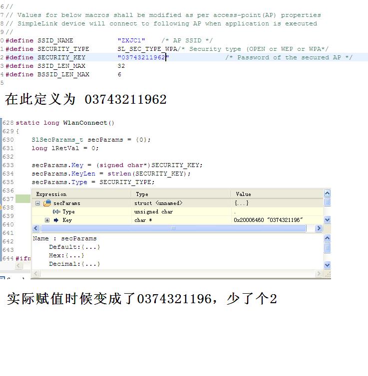 您好,我用CC3200 -LAUNCHXL开发板学习SDK程序时,发现实例程序中 无线密码长度支持10位,即我的无线密码是03743211962,程序定义无线密码也是03743211962,但一仿真起来设置断点,发现程序中static long WlanConnect()函数中SlSecParams_t secParams,secParams.key被赋值成了0374321196少了1位,怎么赋值也不对,难道SDK中密码长度最大支持10位