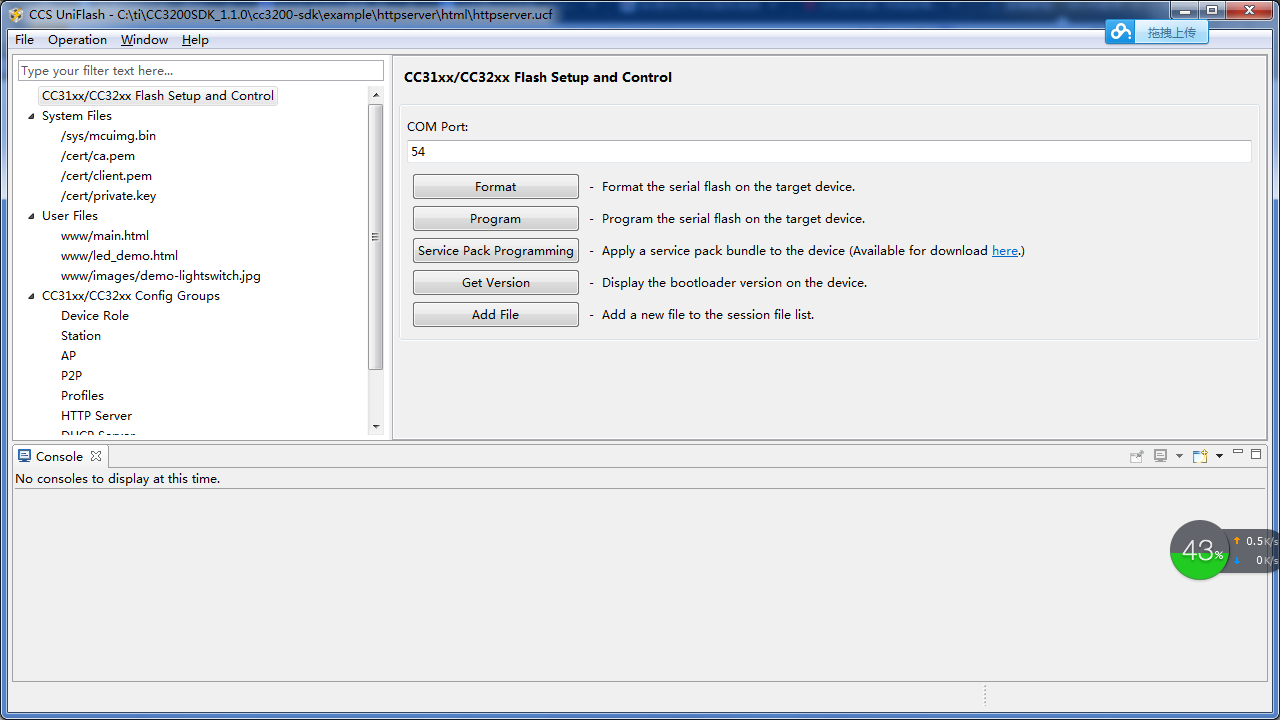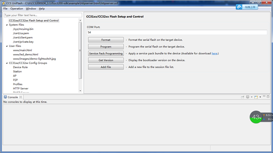 首先我使用uniflash打开该例程下的httpserver.ucf文件,看到在uniflash下面的配置如下所示: