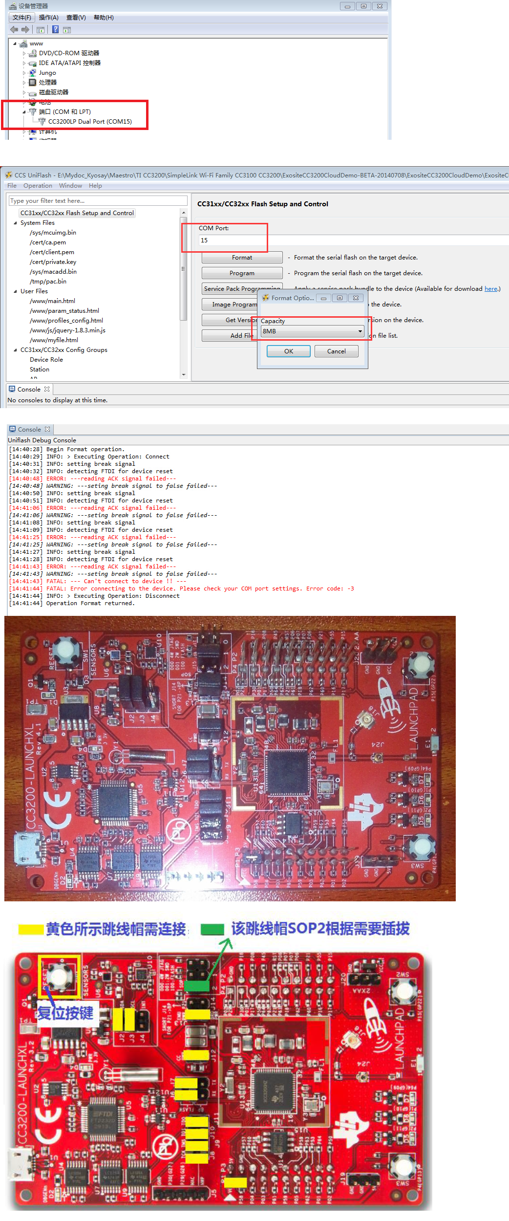 使用uniflash 也擦写不了程序,按复位键后没有反应。擦写信息请看附件的图片,擦写的时候各个跳线是按《CC3200 LaunchPad使用入门05_物联网应用例程》来做的。按这个例程,以前跳线这样跳都能顺利擦写程序。