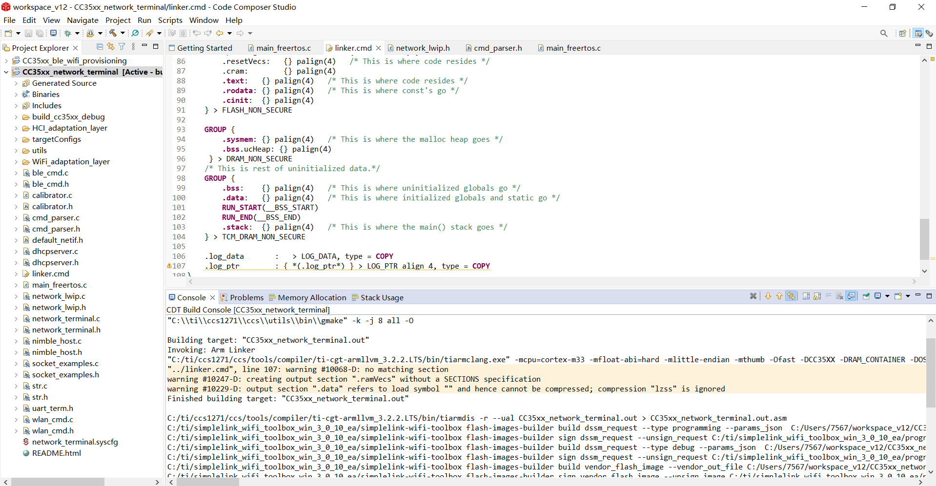 CC3551E: 使用CCS12.7.1编译示例工程CC35xx_network_terminal时出现的3条warnings