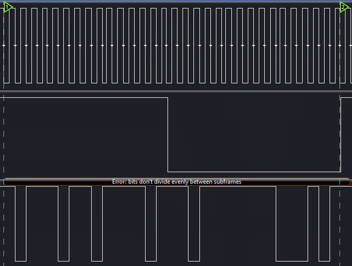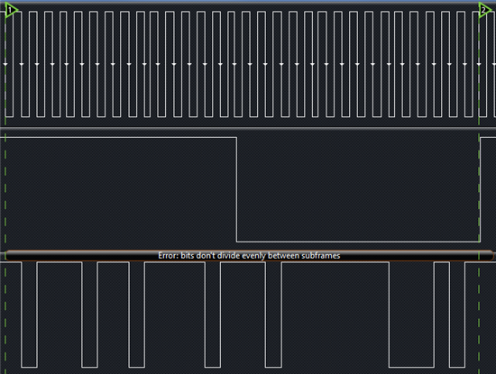 如图,虚线游标1处到虚线游标2处 bit clock有32个下降沿,第32个下降沿时lrc还未到高电平,左声道的数据要在第33个下降沿处结束。
