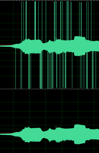 上面是右声道,下面是左声道,只出现在右声道上。尝试了8k,16k,48k等采样率,用的16bit,结果都一样。