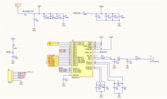 最近使用CC2630 RHB芯片做了快板子,电路参考的TI官方图,如下所示,使用的arm通用下载器jlinkV8, 但是,无法识别芯片,用Flash Programmer 2也检测不到芯片。测试了,芯片供电正常。有做过的朋友给个建议是哪里的问题,还是电路图画的不对?