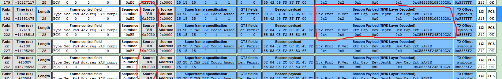 终端入网后抓包分析Beacon Payload 抓包数据中,Stk_Prof、P.Ver、Rtr_Cap、Dev.Cap、Ext.PANID字段数据被改变成0,有遇到过同样问题的吗?