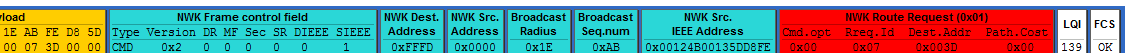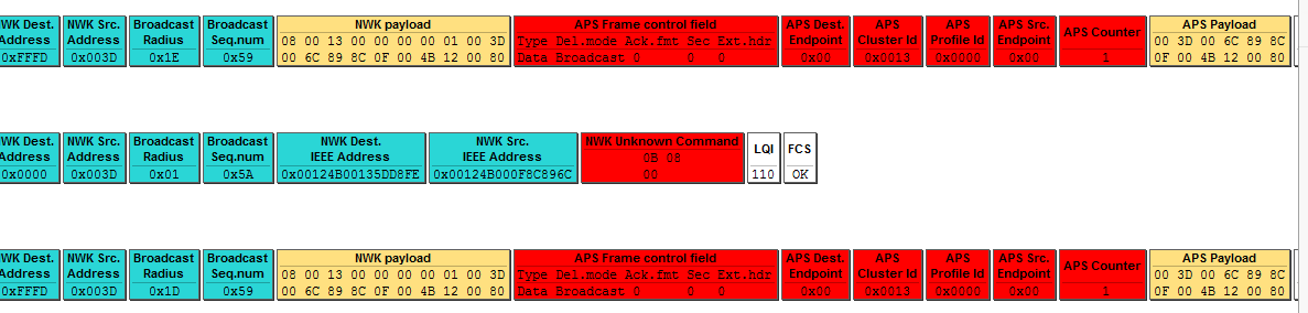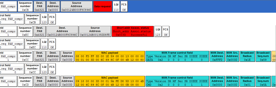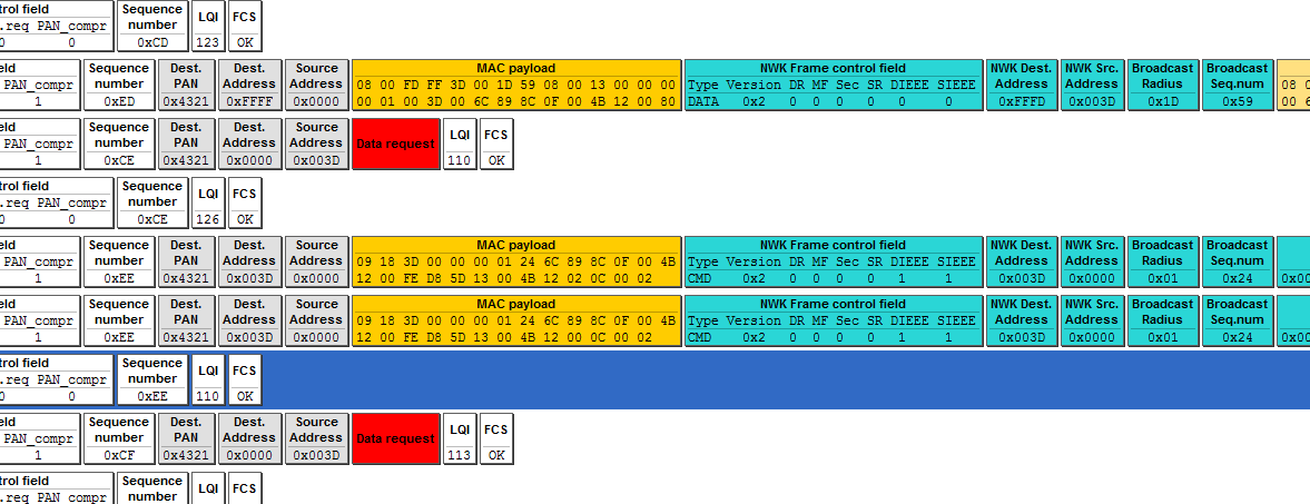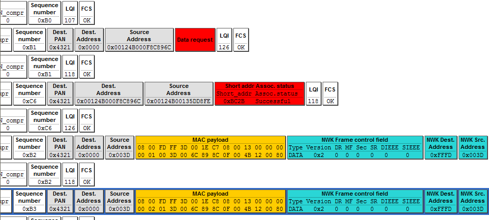 设备能成功加入网络,但是运行一段时间以后,协调器就无法在给他发数据了,(注意这次抓的图和上面那张不一样,但是情况是一样的,地址是0x003d)
