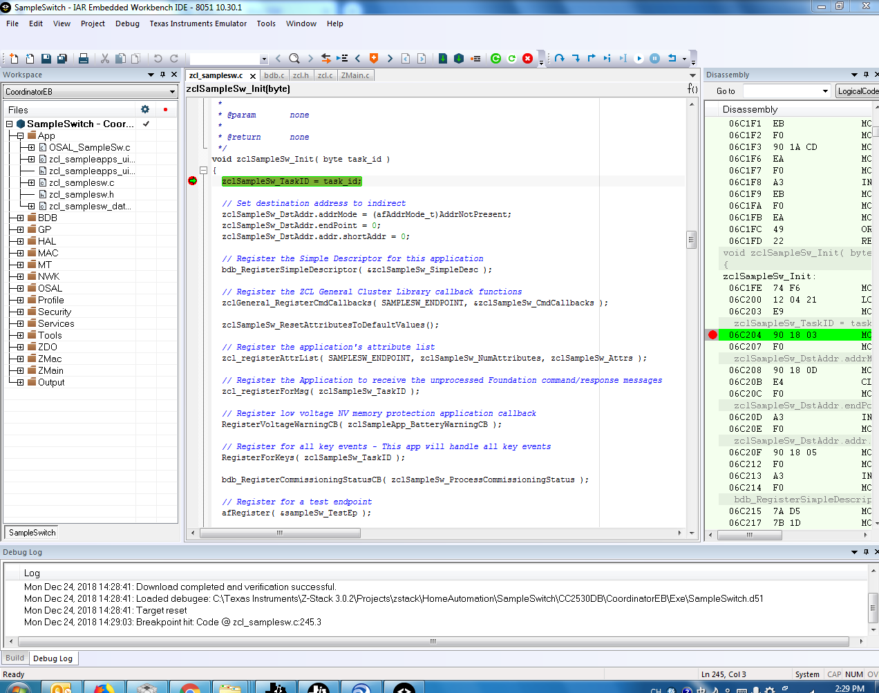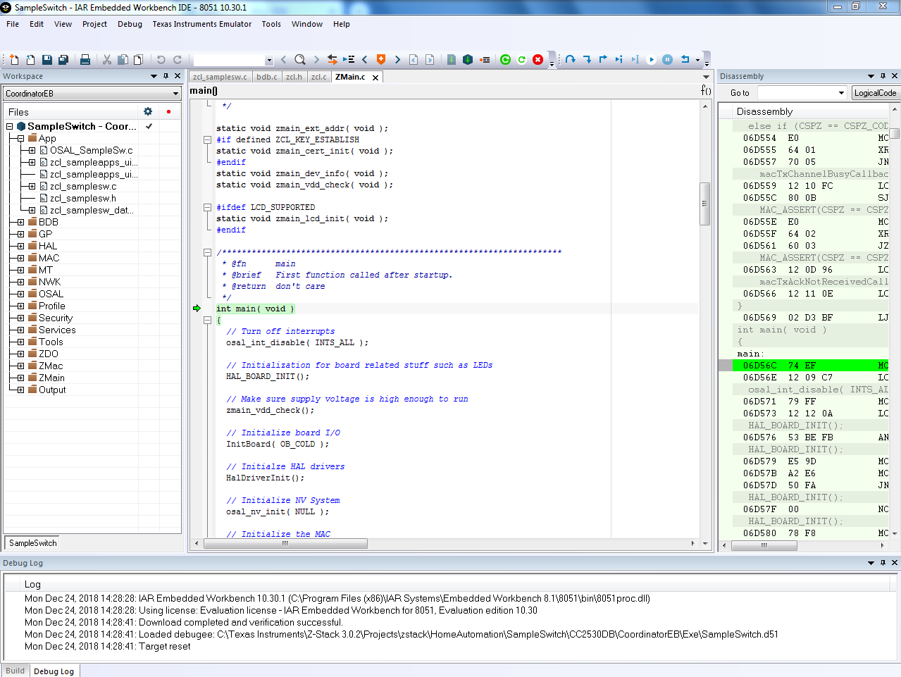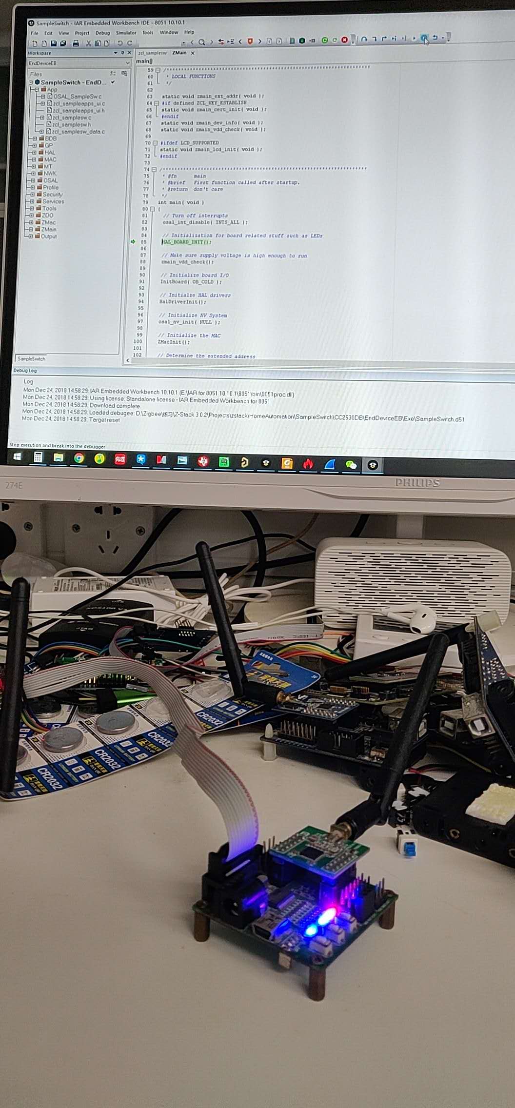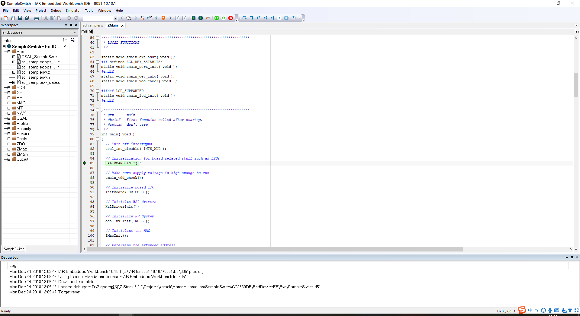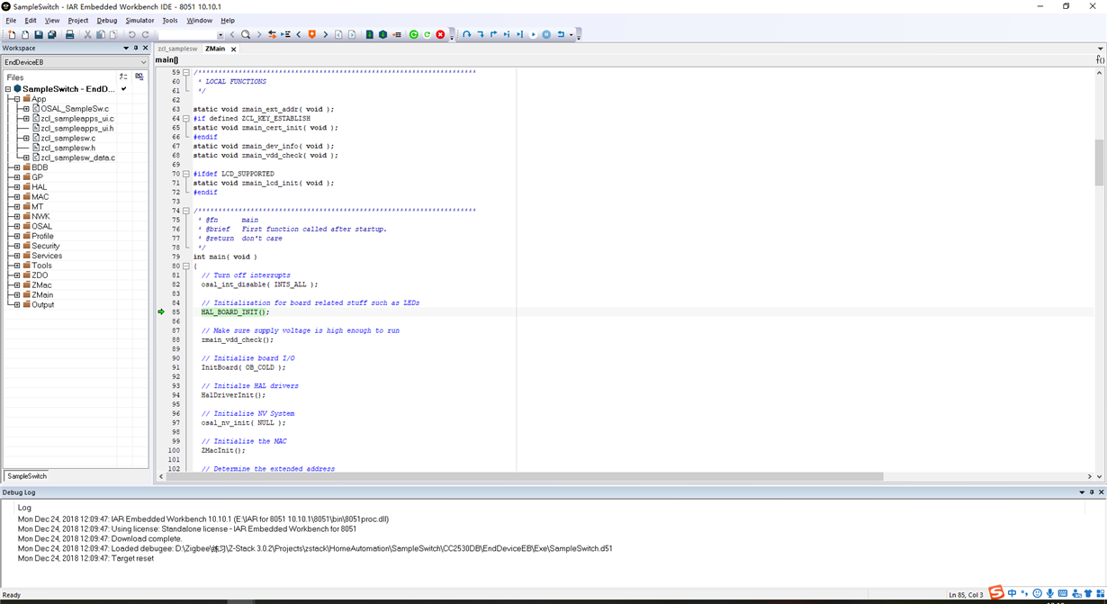 问题描述:如题,Z-Stack 3.0.2协议栈“SampleSwitch”的CC2530例程有BUG。Z-Stack3.0.2协议栈安装包安装后,用IAR打开“SampleSwitch”例程,然后直接编译,烧录程序进CC2530,运行程序,发现程序卡在了main()函数的“HAL_BOARD_INIT();”中出不来。试了“Coordinator”、“router”和“enddevice”类型的程序都不行。然后打开“GenericApp”例程编译烧录后正常运行。