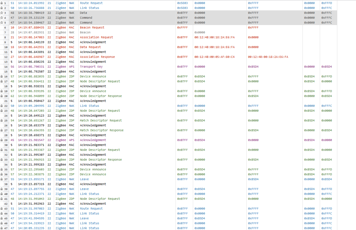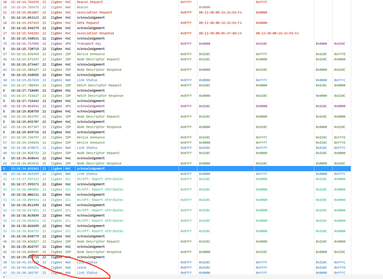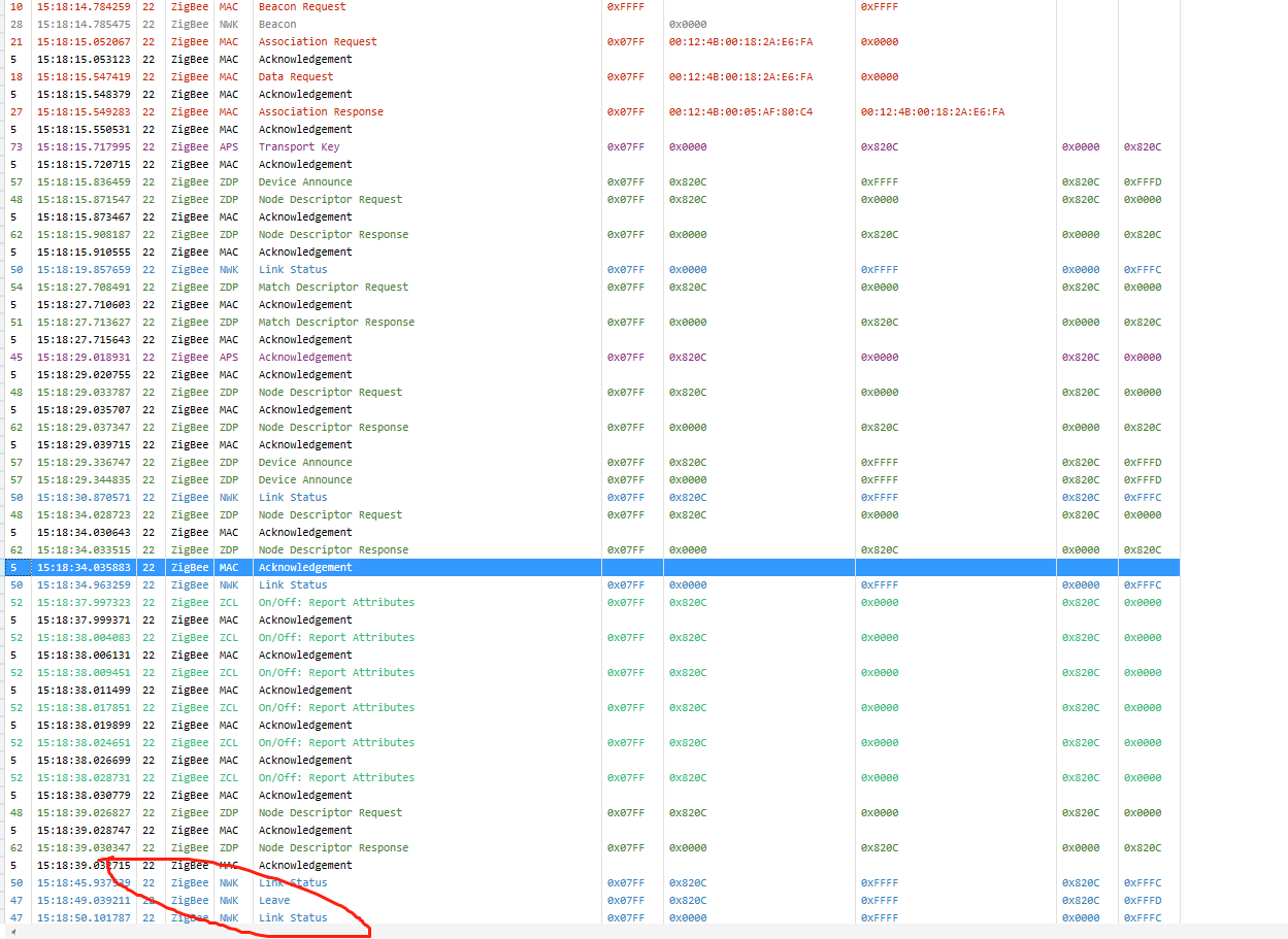 大家好!最近在调试zigbee3.0的协调器(CC2538),直接使用TI例程(SampleLight)修改为协调器。添加路由设备,路由为Light。结果设备能够加入协调器网络。但是紧接着设备会自动发送“leave”,从而导致一段时间之内,设备反复执行入网过程。求指导。谢谢!