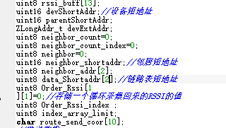 //RSSI uint8 rssi_buff[13]; uint16 devShortAddr;//扢掘傻華硊 uint16 parentShortAddr; ZLongAddr_t devExtAddr; uint8 neighbor_count=0; uint8 neighbor_count_index=0; uint8 neighbor=0; uint16 neighbor_shortaddr;//邁懈傻華硊 uint8 neighbor_addr[42]; uint8 data_Shortaddr[2];//蟈繚桶傻華硊 uint8 Order_Rssi[10][13]=0;//湔揣珨跺悜遠粒摩隙懂腔RSSI腔硉 uint8 Order_Rssi_index ; uint8 index_array_limit; char route_send_coor[30];