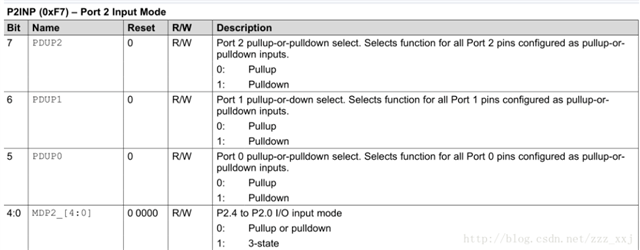 在P2INP中,第0位至第4位是端口2的输入模式选择位,第5位至第7位是端口0、端口1、端口2的上下拉选择位。