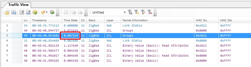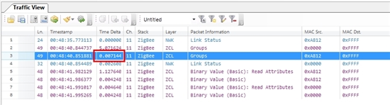 从你给出的psd文件来看,两个广播包之间的时间差为570ms, 数据的传递方式是A发广播,B收到广播后广播。这个570ms可能是由于B设备得到数据延迟或者nwk发发缓存造成的。如果0x4C7B(抓包文件中第二次广播的节点),是End, 这部分时间可能是它Poll到数据的延迟,要验证这个猜测,需要使用两个FFD来测试,广播地址使用0xFFFC。 再一个,B设备的发送缓存造成,由于前一次广播的数据B设备接收到A的广播消息以后,仍然要进行一次广播,这一次广播与它后面要发送的广播之间出现时间差的原因可能是底层将两个广播排队,这个是没有办法的。