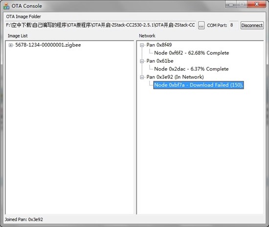 本人基于zigbee协议ZStack-CC2530-2.5.1里的OTA做了一个ota实验,smartrf通过串口接上电脑,我手里有个节点,有2530及无线模块,再给这个节点加上外部存储器M25PE20,最后开启协议栈里的OTA上位机软件OTA console,组网后,节点加入网络,开始更新,数字一直跳转,可是等到100%完成后,显示的是Node oxbf7a---“download failed(150)” ,按道理应该是Node oxbf7a---completed successfully,这是为什么呢,这里既然已经跳转到100%,应该是已经在更新,基本功能应该是有的,是不是校验的问题呢,还是只是显示问题,这里显示100%到底是有没有更新成功呢?求解答。。。