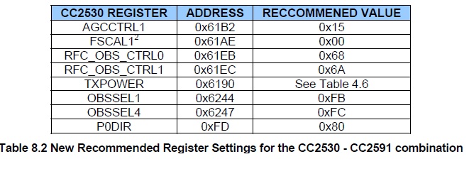 在Using CC2591 Front End with CC2530/1 里,还提到其他寄存器的新值: